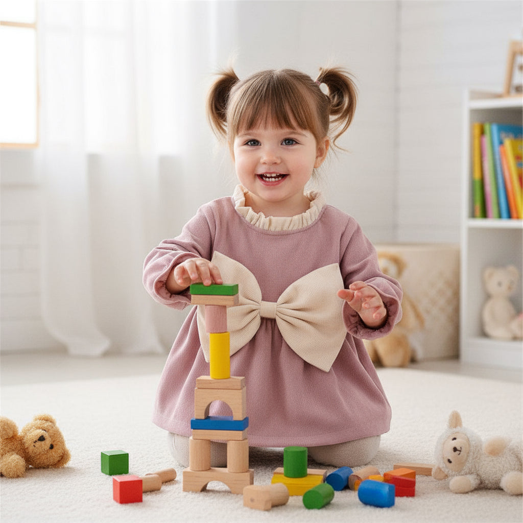 Designed with soft corduroy fabric, it features puffed sleeves, a ruffled neckline, and a large cream bow for a charming finish.