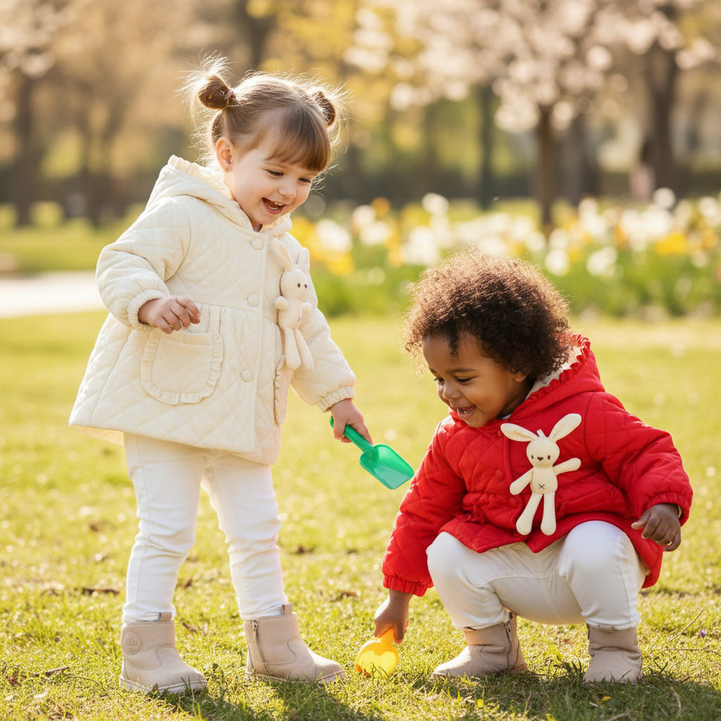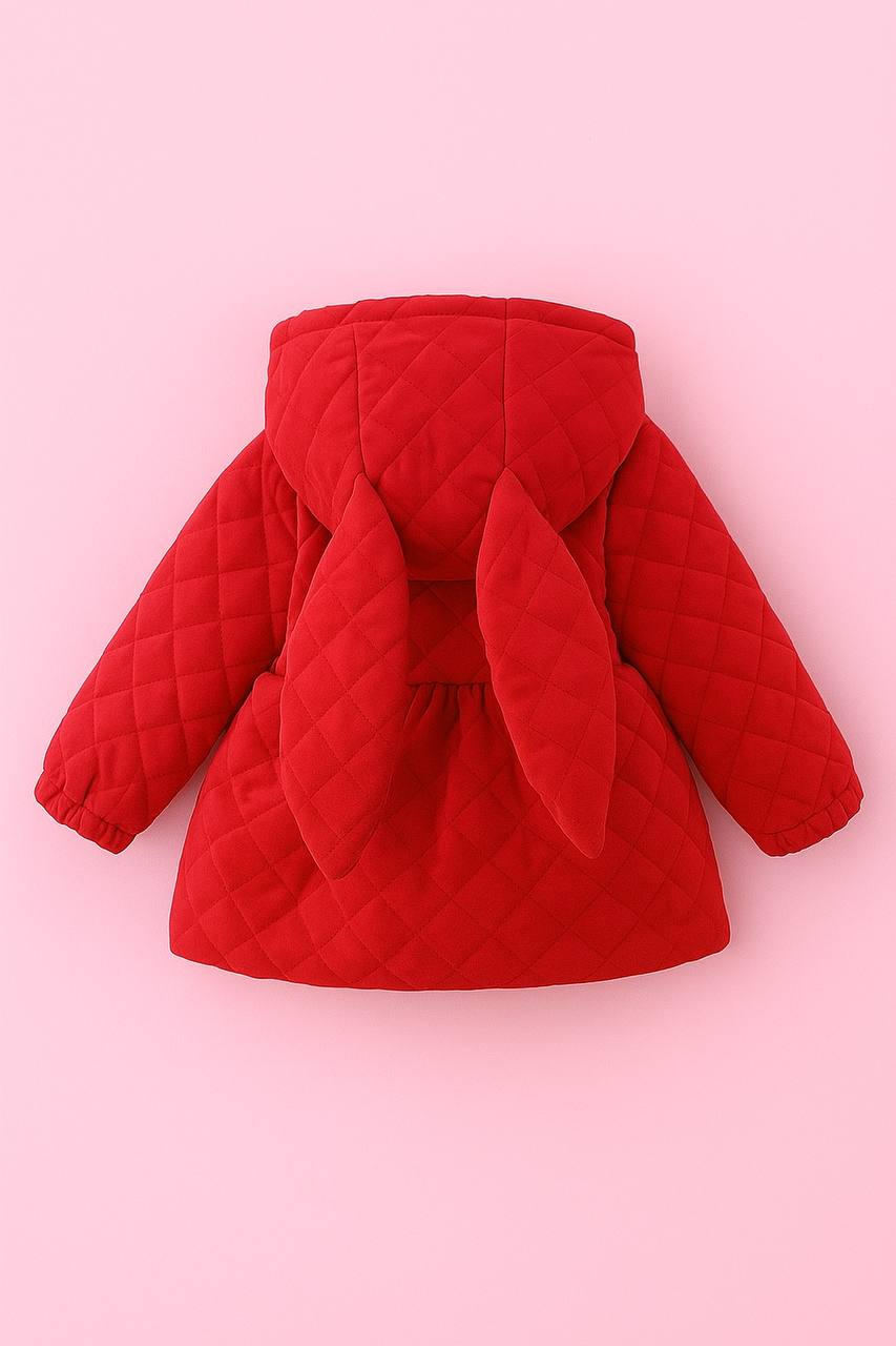 Adorable quilted winter jacket featuring a soft bunny plush on the front,