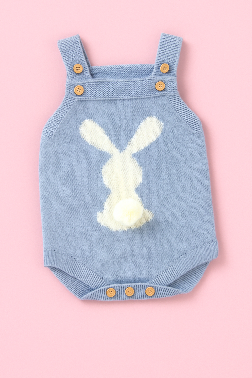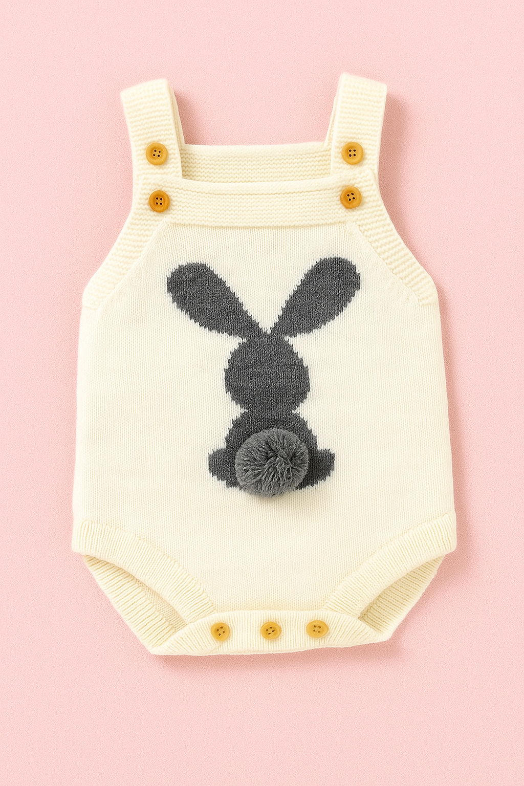 A cute soft-knitted rabbit sling romper with a sweet cartoon design, perfect for daily wear. Lightweight, comfy, and easy to move in, made from soft acrylic knit that’s gentle on baby skin.