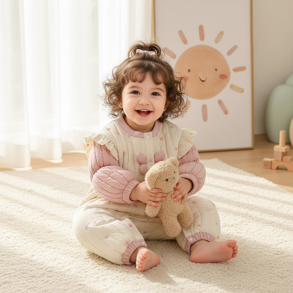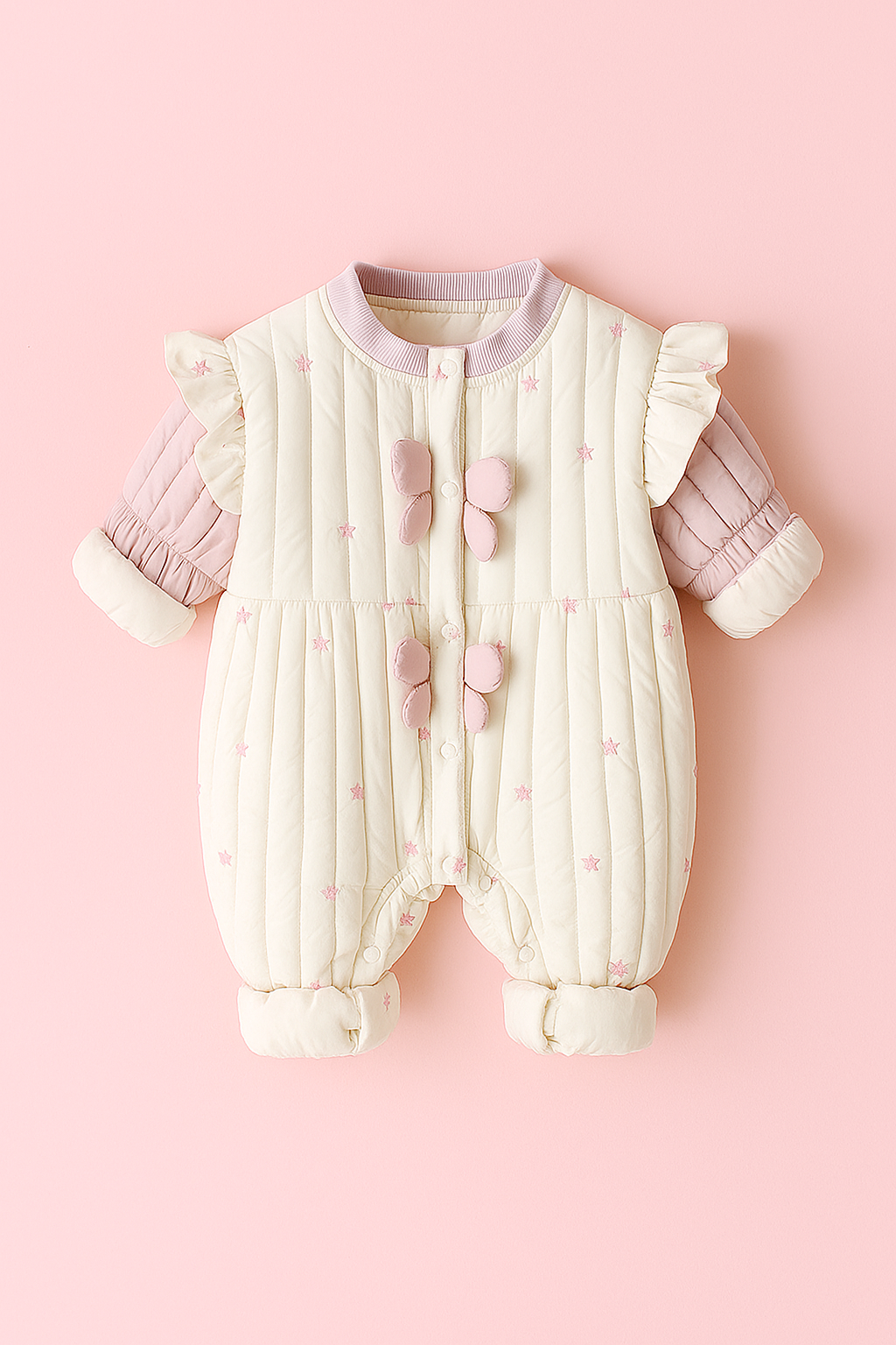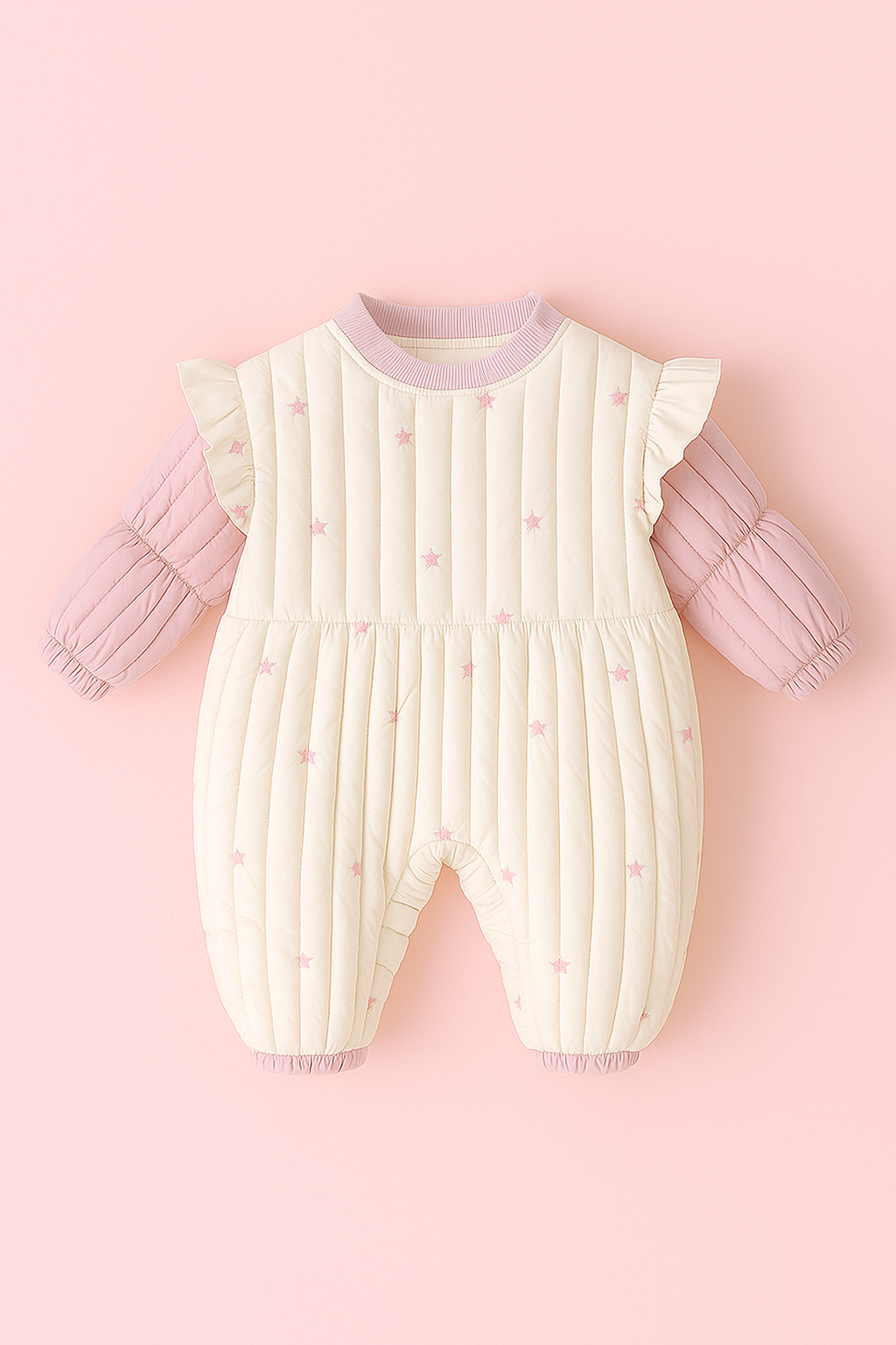 Designed in creamy white with soft pink details, it features sweet embroidered stars and bow accents for a dreamy touch. The quilted texture adds warmth, while the ruffled sleeves bring extra cuteness. Perfect for colder seasons, this one-piece outfit keeps your little one snug, stylish, and comfy all day long.
