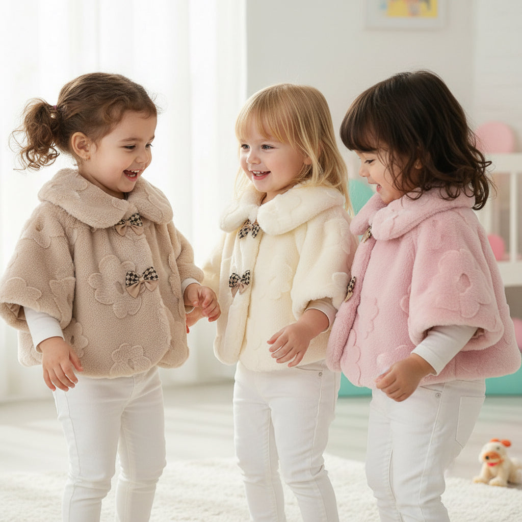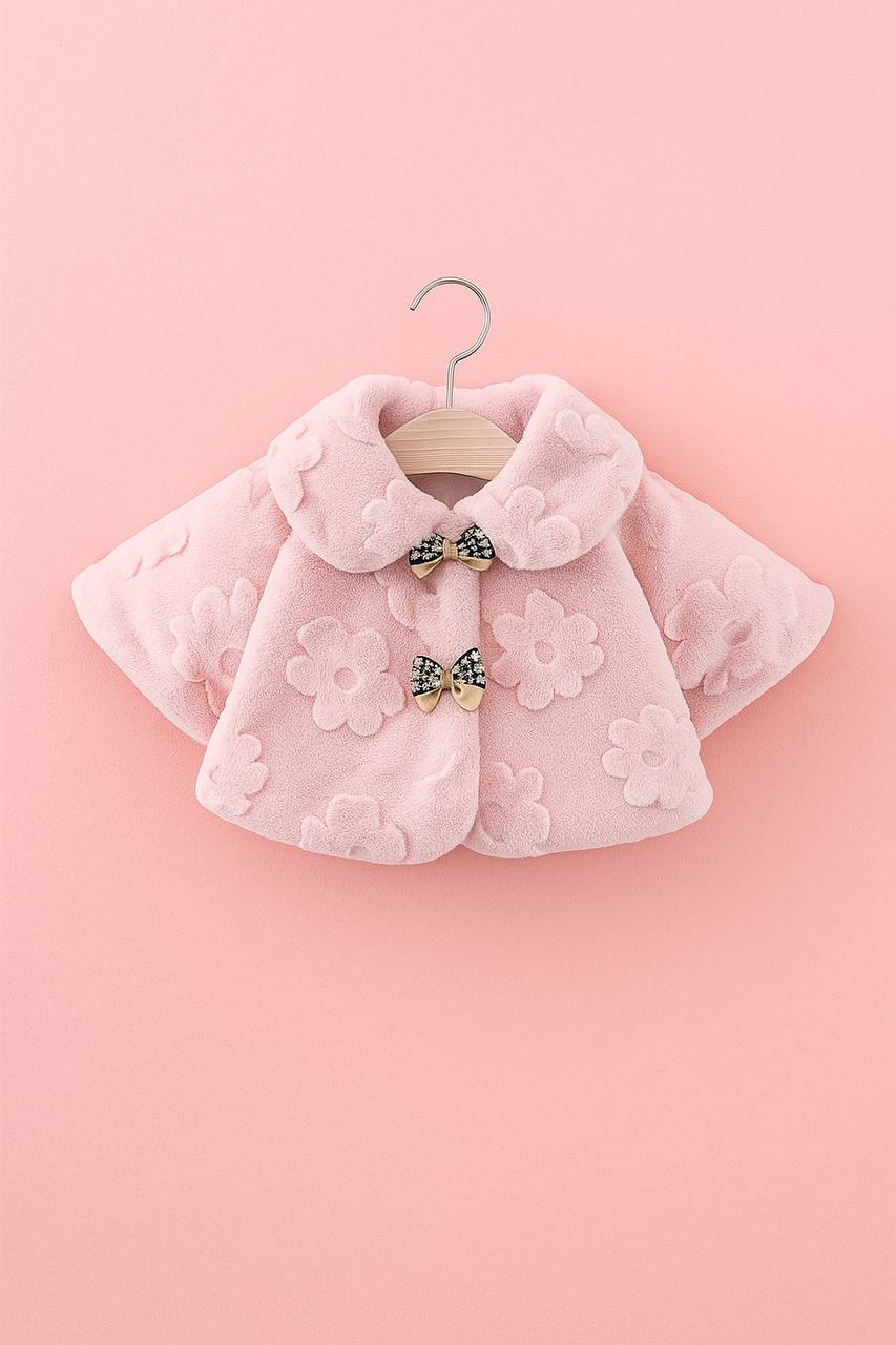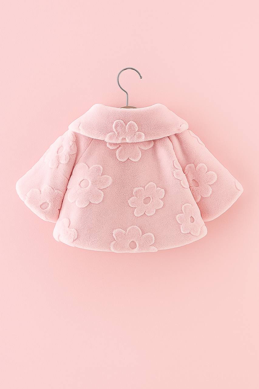 This soft and fluffy winter jacket features delicate embossed flowers, elegant checkered bows, and a rounded collar for a sweet, girly touch.