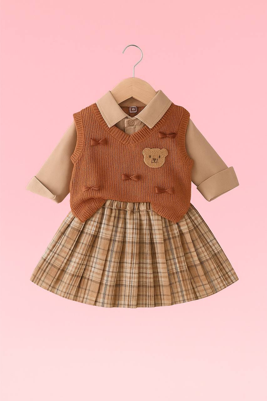 Dress your little one in cozy style with our adorable Caramel Set! This charming outfit includes a soft long-sleeve shirt, a knitted vest with cute bow details, and a pleated plaid skirt β all in warm caramel tones that bring comfort and elegance to any occasion. The sweet teddy patch adds a playful touch, making it perfect for outings, playdates, or capturing those picture-perfect moments.