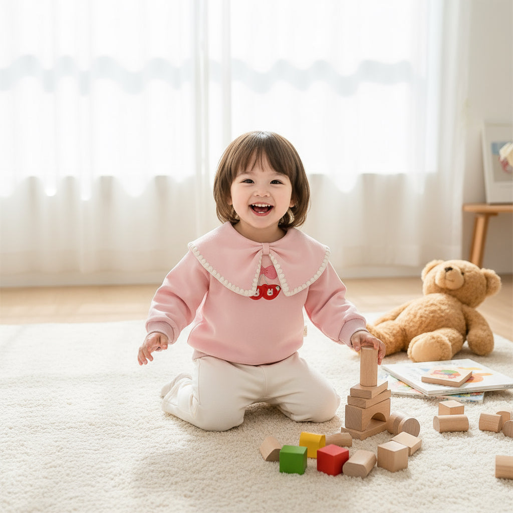 A two-piece baby girl outfit designed for comfort and sweetness.The soft pink top with a bow-style collar and cherry embroidery pairs perfectly with cream-colored pants for a cozy, adorable look.
