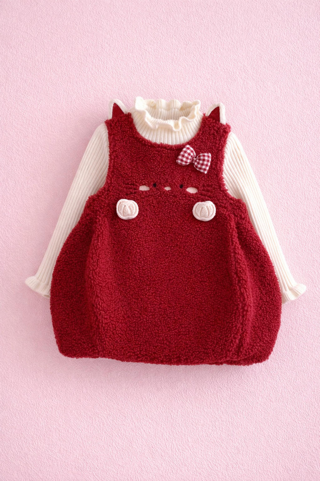 A cozy winter girls’ outfit featuring a soft padded sleeveless dress layered over a ribbed long-sleeve sweater. Designed with adorable cat ear details on the shoulders, a cute embroidered cat face, and a gingham bow for a sweet touch. Warm, comfortable, and special occasions. Includes padded sleeveless dress and ribbed long-sleeve sweater (worn underneath)