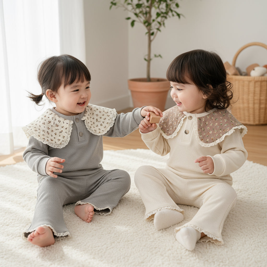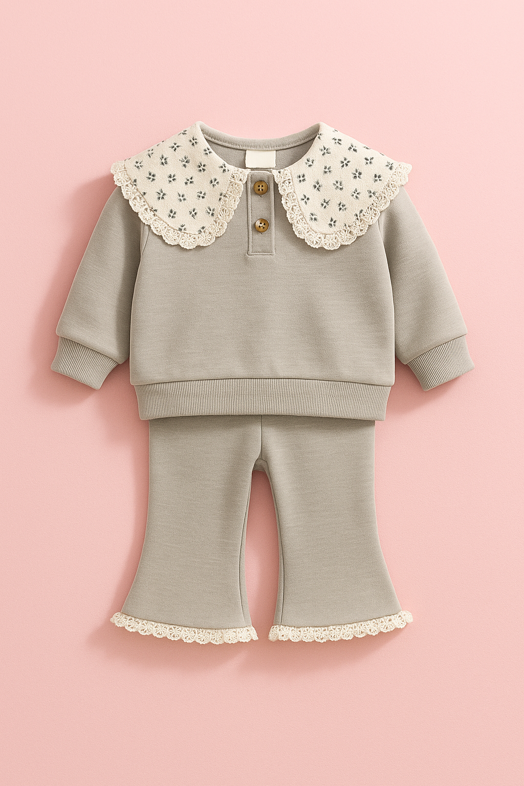 A charming two-piece set designed for baby girls, featuring a soft long-sleeve top with a floral lace collar and matching flared pants.