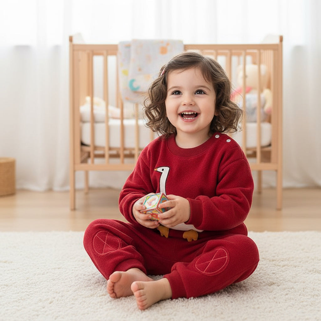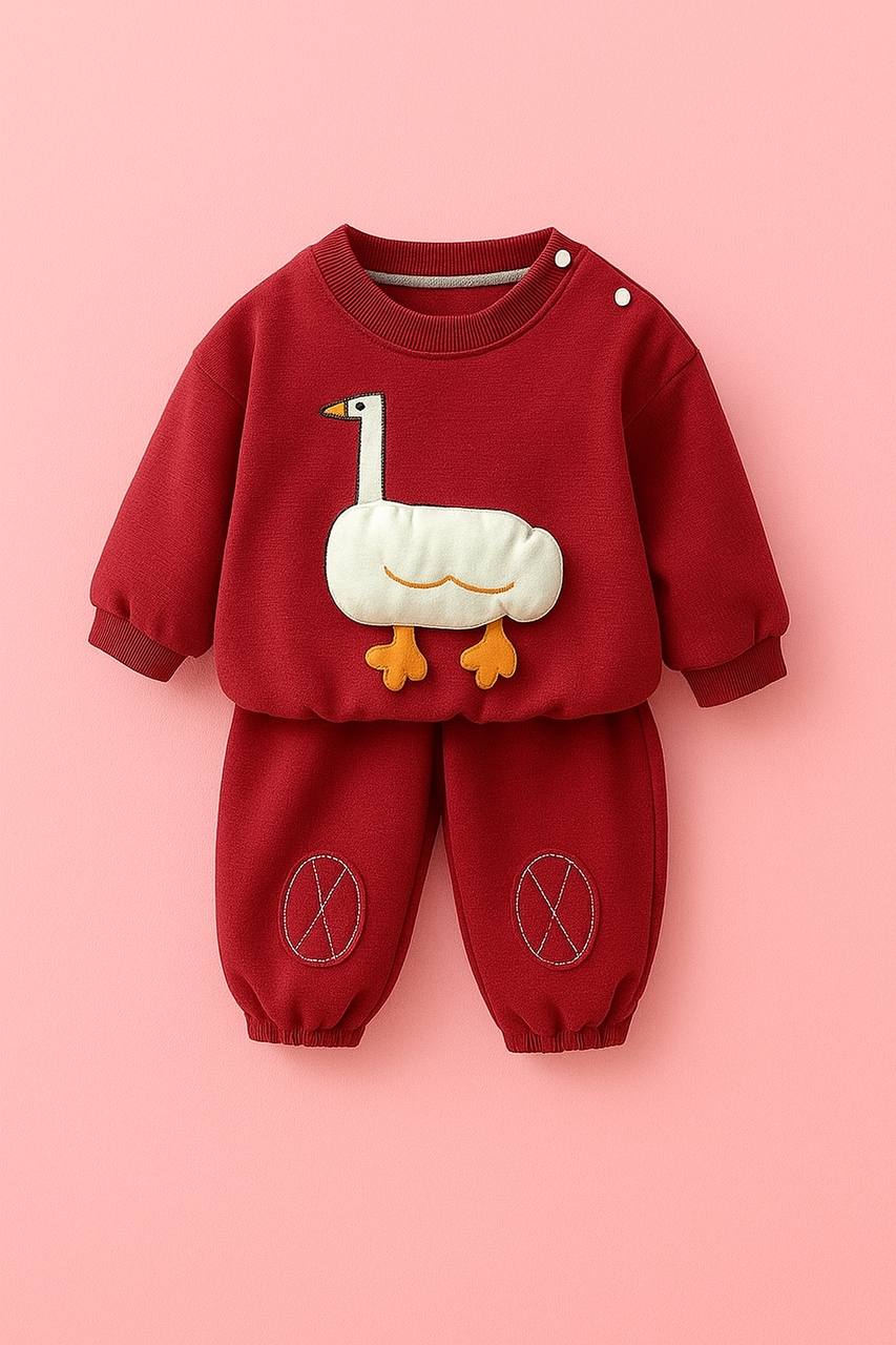 The cutest red two-piece outfit for little explorers. Made from soft cotton with a fuzzy goose patch for a playful touch.