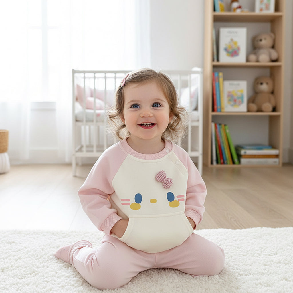 Adorable 2-piece cotton set designed for baby girls, featuring a soft sweatshirt with a cute cartoon face and a tiny gingham bow paired with matching pink pants. The fabric is gentle, breathable, and perfect for everyday comfort.