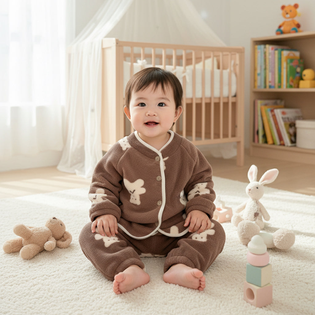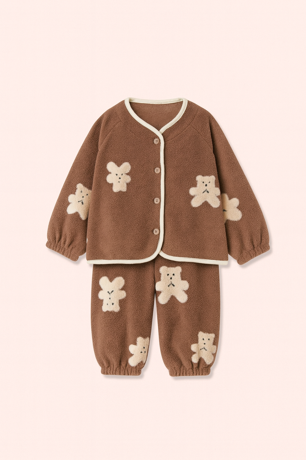 This is a soft, warm, winter-ready fleece pyjama set made from plush snow-flake textured fabric. The material is thick, cozy, and gentle on the skin, perfect for colder seasons. The set includes a long-sleeve top and matching pants, ideal for home, sleep, and indoor warmth.