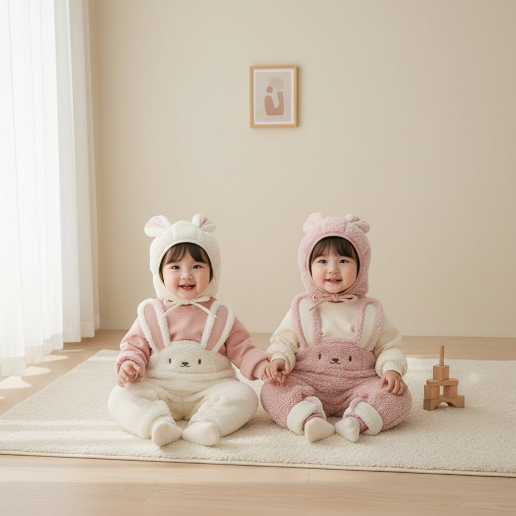 Adorable 2-piece set! Featuring a soft pink sweatshirt and a fluffy white jumpsuit with bunny ears, it’s made for cozy cuddles and endless cuteness.