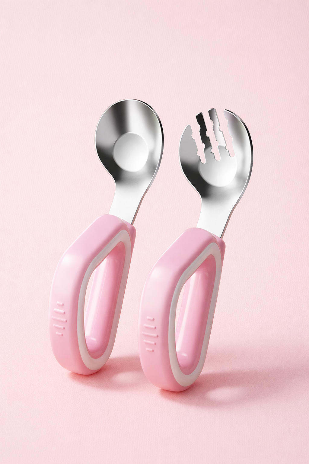 2-piece baby training spoon and fork set made of food-grade 316 stainless steel with soft silicone curved handles, designed for babies 3+ months to help them learn self-feeding safely and comfortably with an easy-grip, smooth-edge, and durable design.