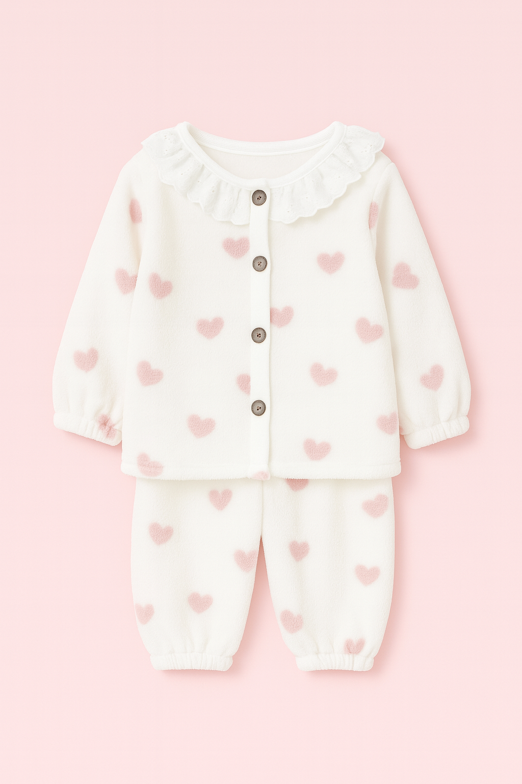 This is a soft, warm, winter-ready fleece pyjama set made from plush snow-flake textured fabric. The material is thick, cozy, and gentle on the skin, perfect for colder seasons. The set includes a long-sleeve top and matching pants, ideal for home, sleep, and indoor warmth.