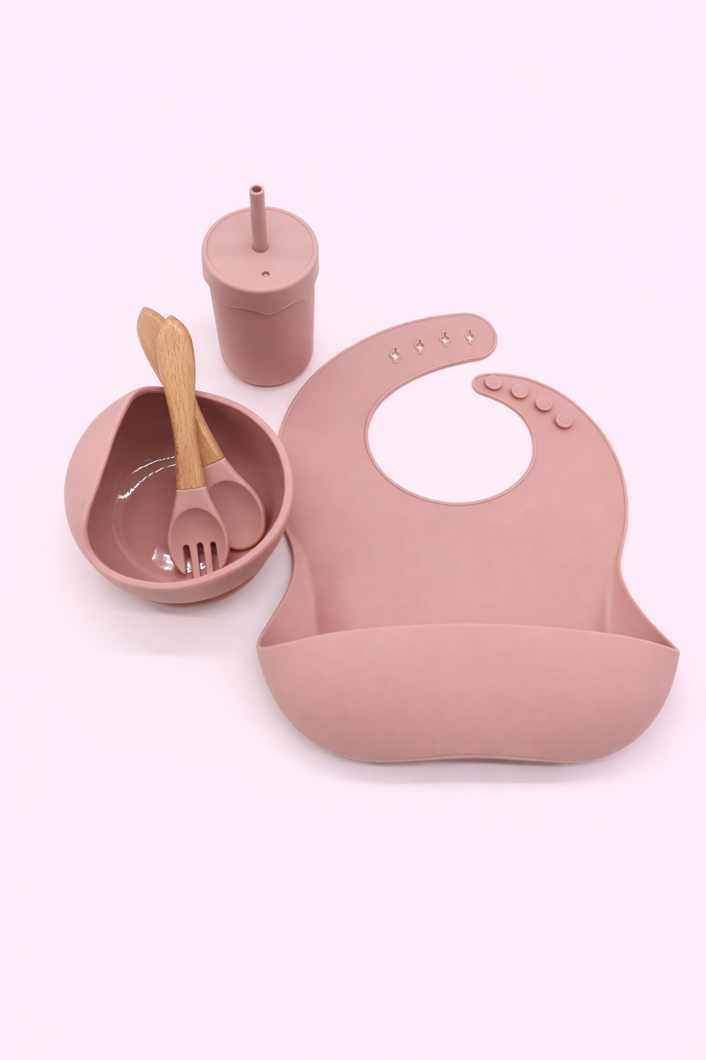 5-piece silicone baby tableware set made from food-grade silicone, BPA-free and safe for babies 6 months+, includes silicone bowl, adjustable bib, straw drinking cup, spoon, and fork, soft and flexible material gentle on gums, easy-grip utensils with wooden handles, spill-catch bib pocket, suitable for self-feeding training, easy to clean and dishwasher safe, lovely simple design, ideal for daily meals at home or travel.