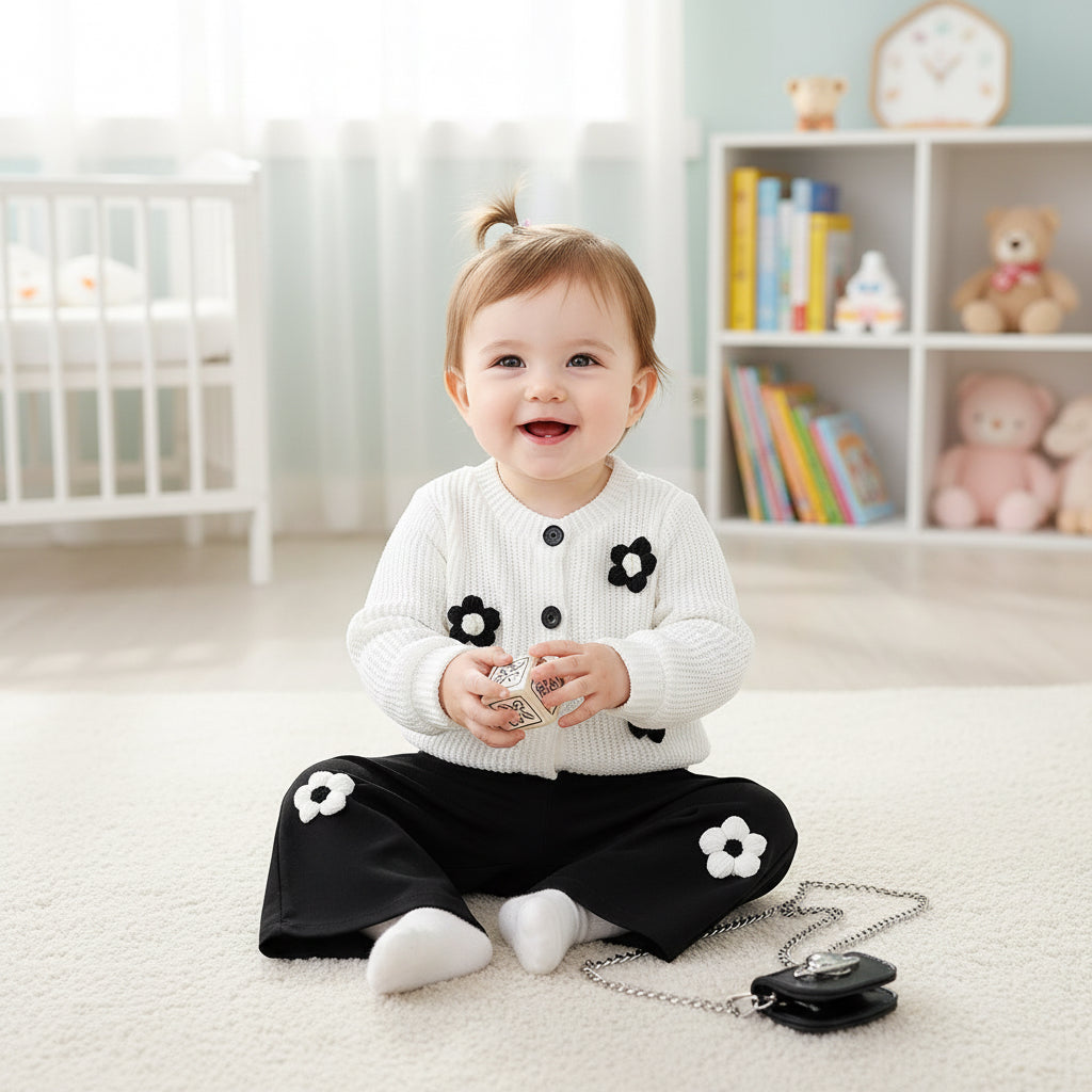 A soft and elegant two-piece outfit for baby girls, featuring a cozy knitted long-sleeve top decorated with delicate floral yarn details. The gentle texture and simple European-inspired design give the set a sweet and timeless look. Paired with matching long pants for a complete.