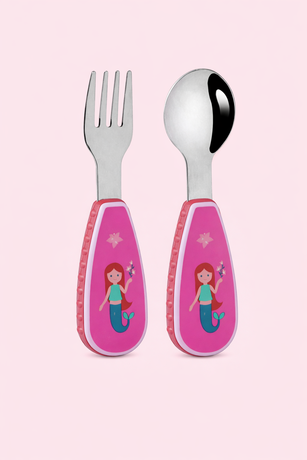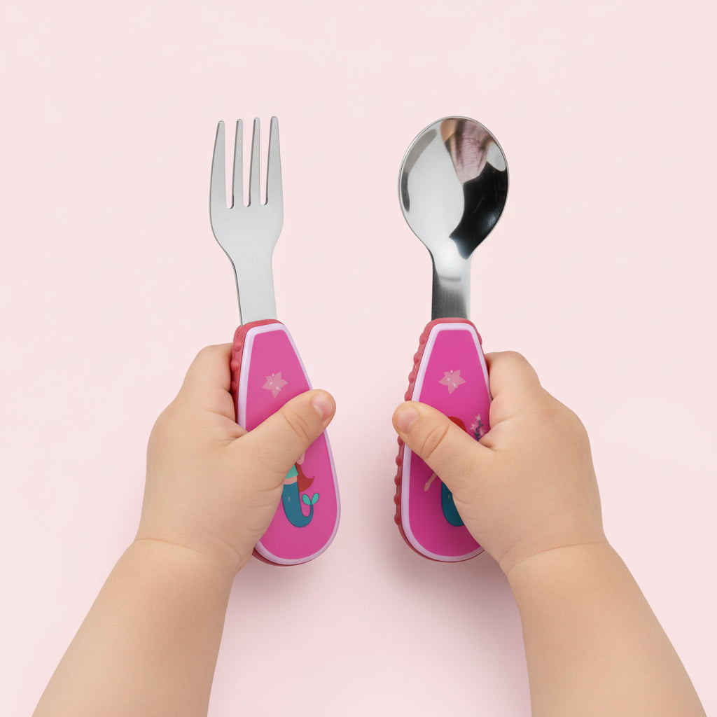 Children’s feeding spoon and fork set made from food-grade 304 stainless steel, designed for babies and toddlers 6+ months, with soft non-slip ergonomic handles that are easy to grip, smooth rounded edges safe for little mouths, lightweight and perfect for self-feeding training.