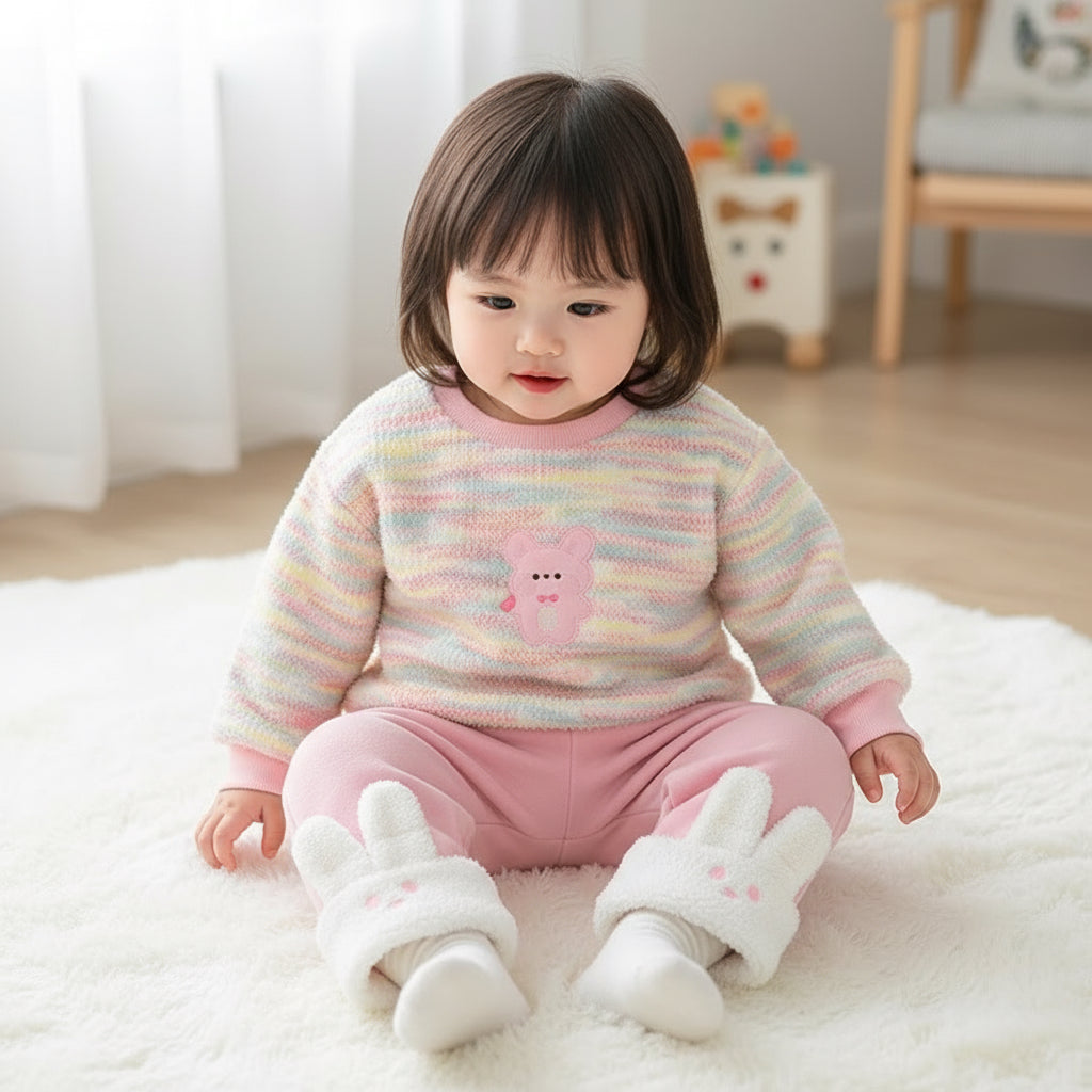 The Rainbow Bunny Set includes a soft pastel striped sweater paired with cozy pink pants — a perfect winter outfit for little girls.