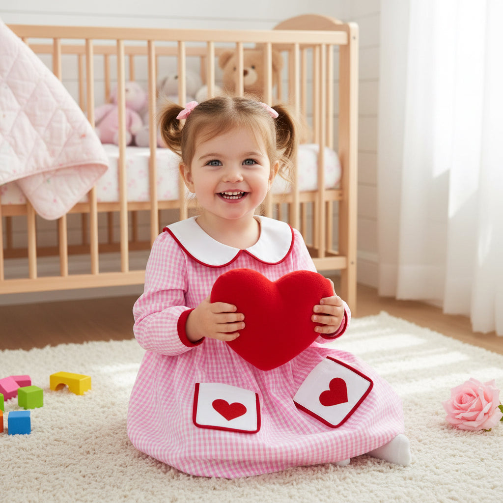 A sweet baby girl gingham dress with long sleeves, a classic white collar, and adorable heart pockets, perfect for everyday wear and special occasions.
