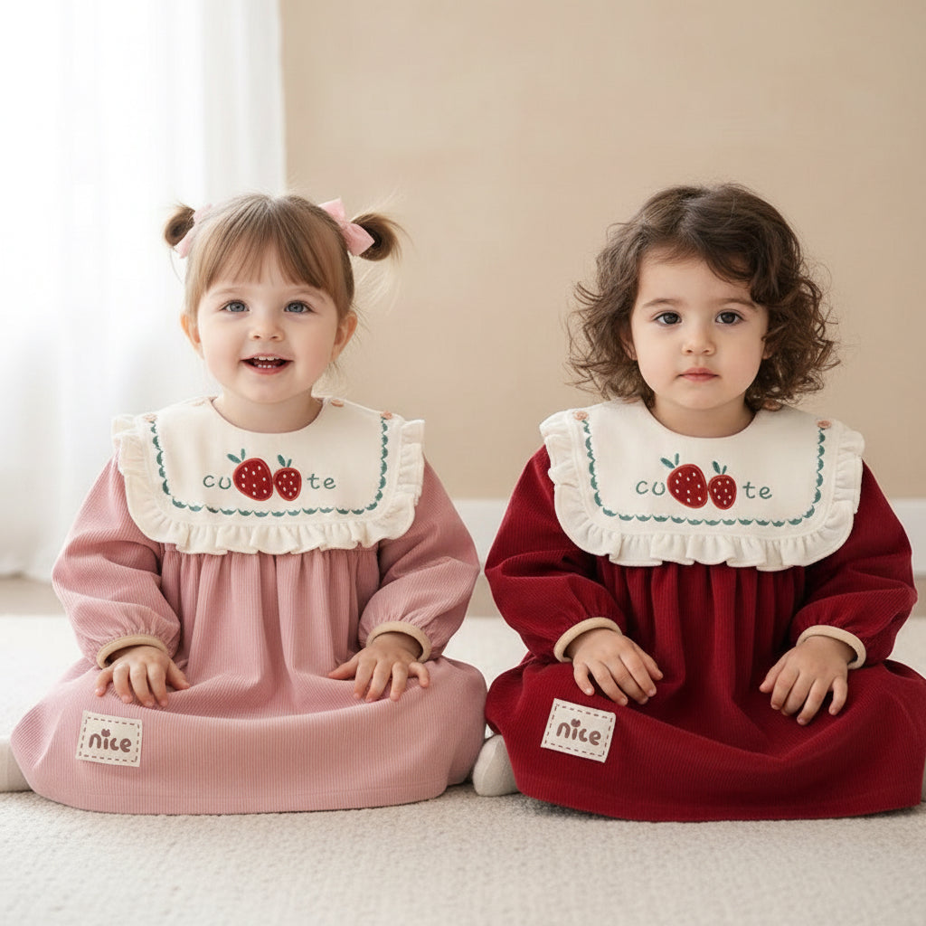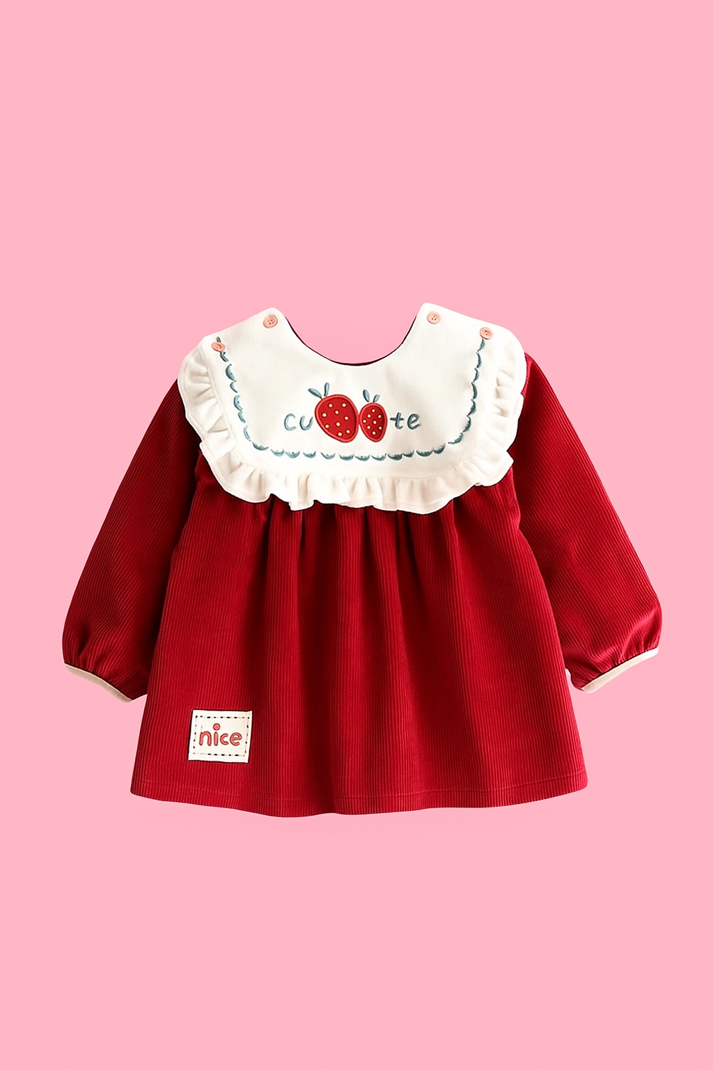 Adorable corduroy baby dress featuring sweet strawberry embroidery on a soft ruffled collar. Made from cozy cotton-blend fabric, perfect for keeping your little one warm and stylish.