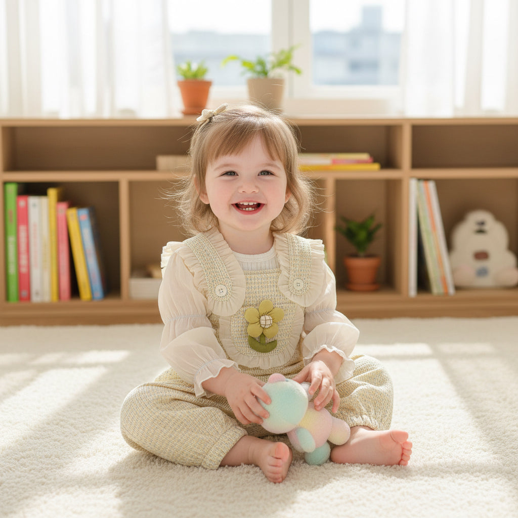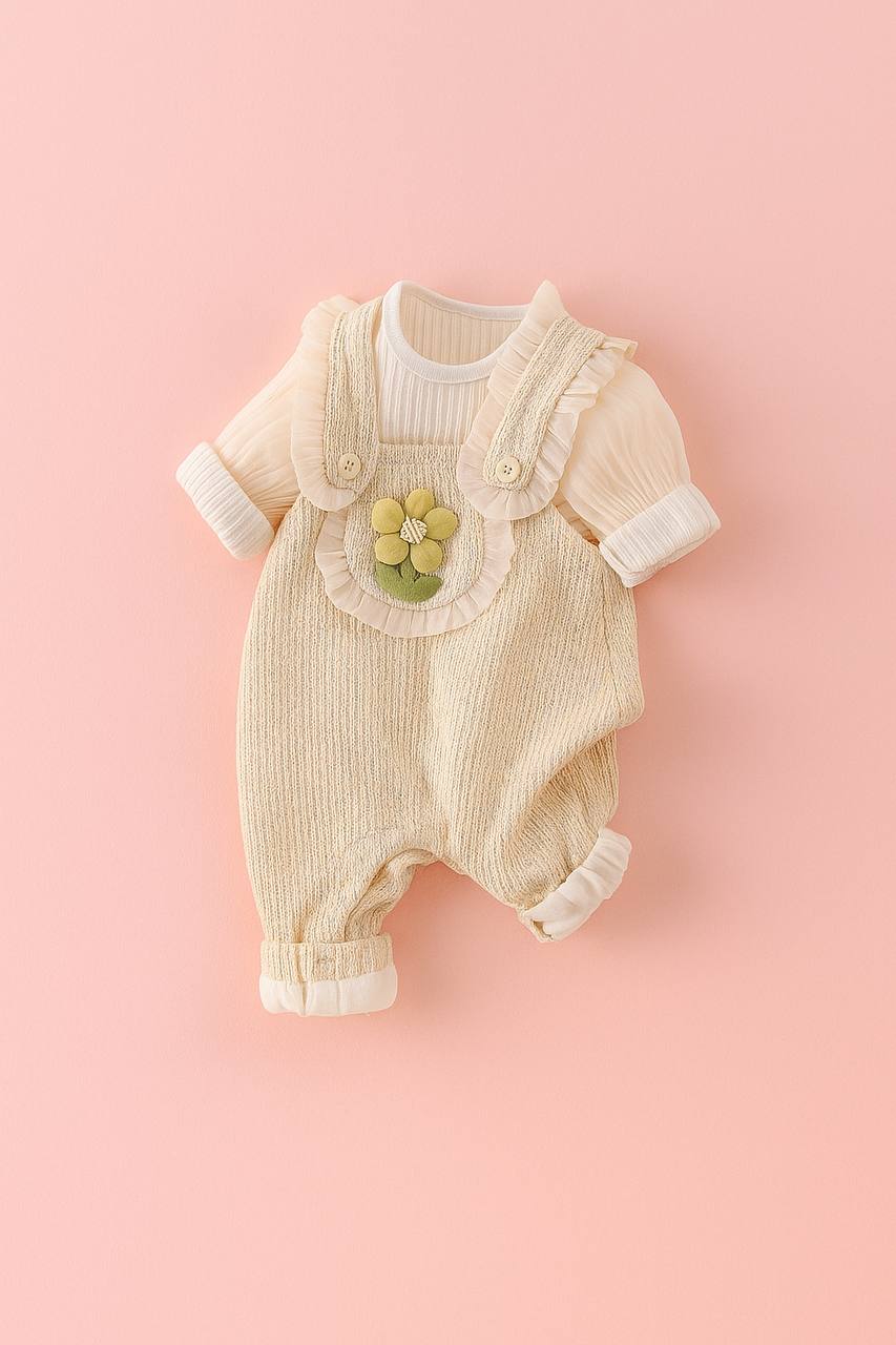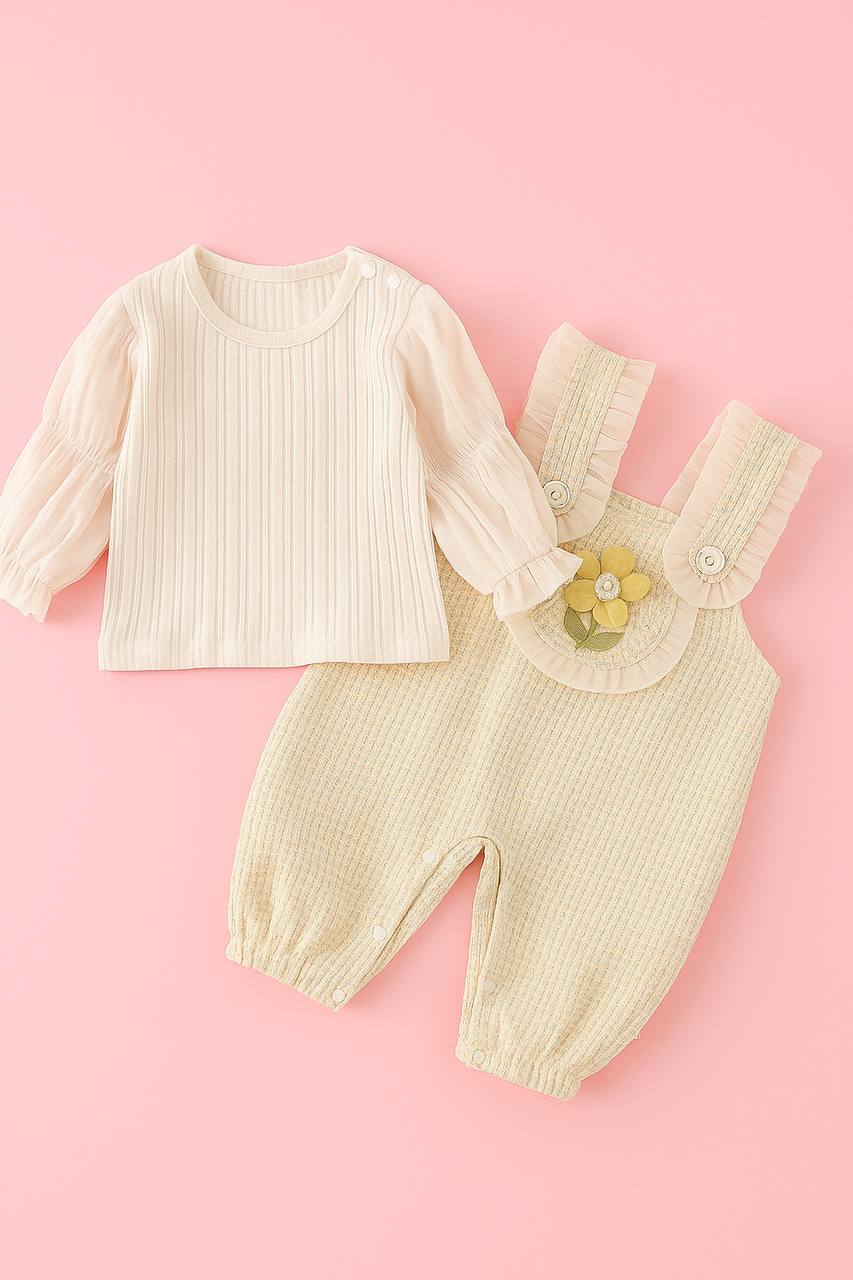 Adorable two-piece baby outfit featuring a soft cream long-sleeve top with floral details and matching overalls.