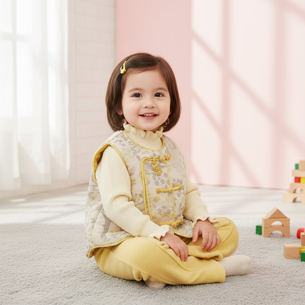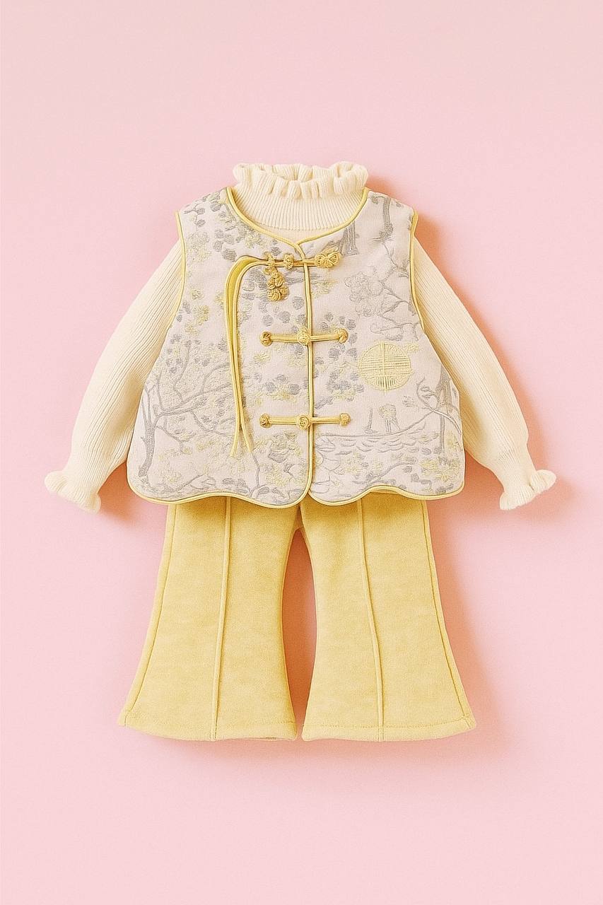 The set includes a thickened woven brocade vest with floral details, paired with a soft apricot knitted inner sweater and matching trousers. The fabric is warm, cozy, and gentle on the skin, making it perfect for cold winter days.