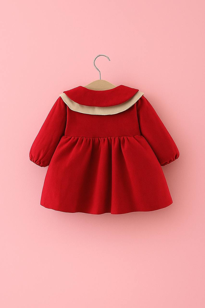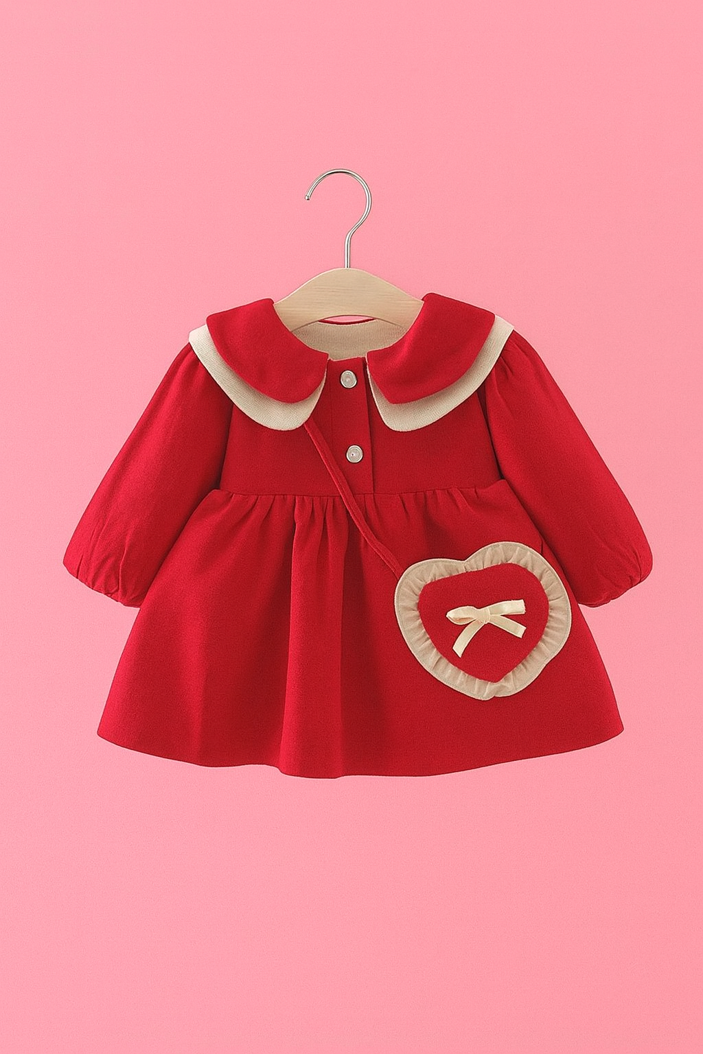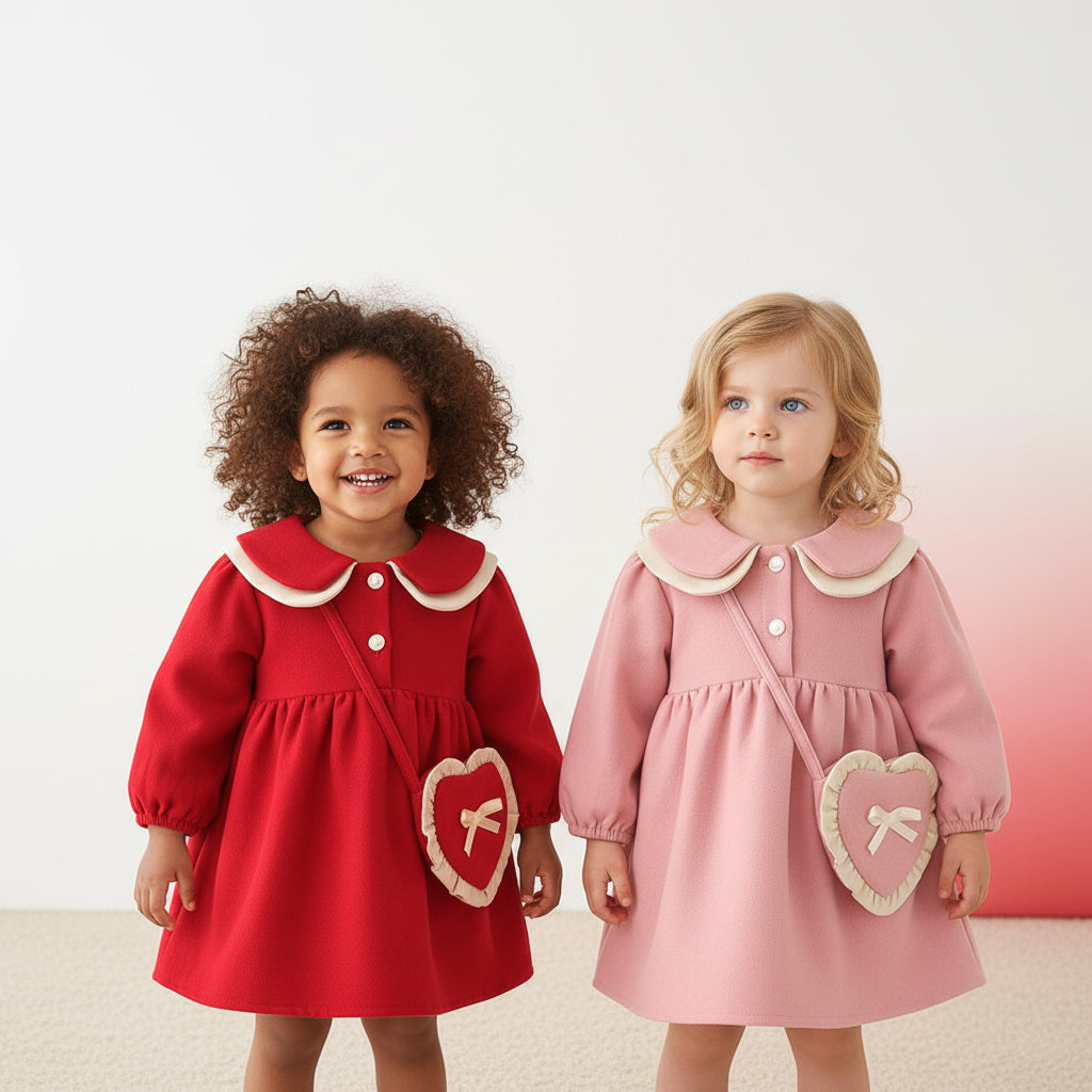 Crafted from soft cotton with a layered Peter Pan collar and heart pocket detail, this dress is perfect for festive outings and cozy days.